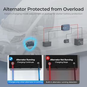 -?Proteja a bateria de partida?Este carregador DCC de 12 V integrado não apenas possui detecção de funcionamento do alternador embutida para garantir que o carregamento ocorra apenas quando o motor está funcionando, protegendo a bateria do veículo, mas também possui estratégias de carregamento inteligentes. Mesmo durante o instante de partida do veículo, ele ajusta rapidamente o modo de carregamento, garantindo que não haja danos à bateria de partida.