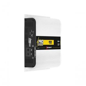 Carregador De Baterias Taramps Pro Charger 40a 0,93kva Apresentamos a Pro Charger 40A. Esta fonte e carregador de baterias bivolt (127/220V AC), possui ajuste de tensão variável (12V DC a 14.4V DC) e indicador de carga completa. Capaz de fornecer até 40 Amperes, pode ser usada como: Carregador de baterias, fonte de alimentação, auxiliar para sistemas de som automotivo, entre outras. *Imagens meramente ilustrativas. ALIMENTAÇÃO: Bivolt Automático (127/220VAC)FAIXA DE TENSÕES EM REDE 127V: 100 ~ 140V ACFAIXA DE TENSÕES EM REDE 220V: 200 ~ 240V ACCORRENTE NOMINAL MÁX. DE SAÍDA: 40APOTÊNCIA MÁXIMA DE SAÍDA: 560WEFICIÊNCIA: 90%CONSUMO MÁX. EM REDE 127V: 11ACONSUMO MÁX. EM REDE 220V: 09AFLUTUAÇÃO MÁXIMA EM PLENA CARGA:<5%FUSÍVEL DE ENTRADA (INTERNO): 10ATENSÃO DE SAÍDA 12V: ~ 14.4V 2%DIMENSÕES (LXAXP): 182 x 52 x 170mmPESO: 1,20Kg Apresentamos a Pro Charger 40A. Esta fonte e carregador de baterias bivolt (127/220V AC), possui ajuste de tensão variável (12V DC a 14.4V DC) e indicador de carga completa. Capaz de fornecer até 40 Amperes, pode ser usada como: Carregador de baterias, fonte de alimentação, auxiliar para sistemas de som automotivo, entre outras. *Imagens meramente ilustrativas. ALIMENTAÇÃO: Bivolt Automático (127/220VAC)FAIXA DE TENSÕES EM REDE 127V: 100 ~ 140V ACFAIXA DE TENSÕES EM REDE 220V: 200 ~ 240V ACCORRENTE NOMINAL MÁX. DE SAÍDA: 40APOTÊNCIA MÁXIMA DE SAÍDA: 560WEFICIÊNCIA: 90%CONSUMO MÁX. EM REDE 127V: 11ACONSUMO MÁX. EM REDE 220V: 09AFLUTUAÇÃO MÁXIMA EM PLENA CARGA:<5%FUSÍVEL DE ENTRADA (INTERNO): 10ATENSÃO DE SAÍDA 12V: ~ 14.4V 2%DIMENSÕES (LXAXP): 182 x 52 x 170mmPESO: 1,20Kg Ean: 7898556848145