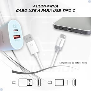 O KIT acompanha: 1 – Carregador de parede com 2 Saídas (PD Tipo C 3.0 / QC 4.0) 1 – Cabo de 1 metro com pontas USB Tipo A para USB Tipo C