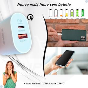 ESPECIFICAÇÕES TÉCNICAS: - Capaz de carregar Ni-CD, Ni-MH baterias de Li-on - Comprimento do cabo 1 metro - Capacidade de carregamento 9100mAh por hora - Entrada: 110V – 220V - Saída: DC5V-9.1A, 9V-4.6A, 12V-3.6A - Potência: 40W - Saídas: PD Tipo C 3.0 / QC 4.0 - Cabo Incluso: USB-A para Tipo-C