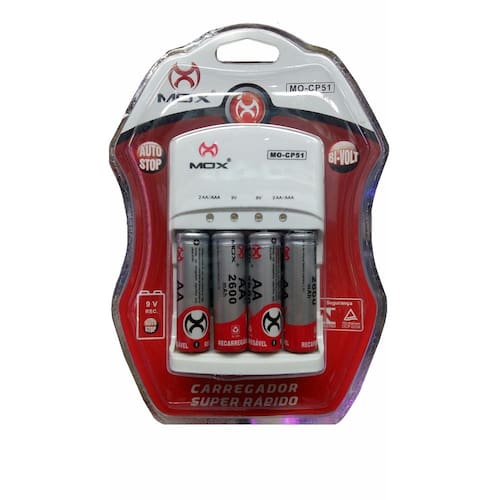 DESCRIÇÃO: Carregador De Pilhas RECARREGÁVEIS Mox CP51 - Para 4 Pilhas Nimh Aa Ou Aaa Ou 2 Baterias 9V RECARREGÁVEIS. - Auto Stop,Desliga Com A Carga Completa Para Pilhas E Baterias. - 4 Leds Na Cor Azul Indicando O Processo De Carga. - 4 Canais De Carga Independentes. - Bi-Volt AUTOMÁTICO - Plug Articulado. - Entrada: Ac 100 240V - 50/60HZ, 50MA 5W MÁX - SAÍDA: Dc 2,4V - 400 Ma Aa/Aaa - Aa 200MA Aa 200MA 4 - Aaa 200MA 2 Aaa 200MA 4 - 9V Dc 20MA Ean: 7898563935685