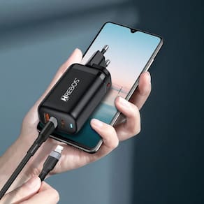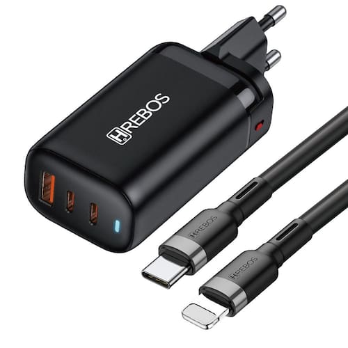 Carregador ultrarrápido com 65W de potência total. Possui três saídas independentes para carregamento simultâneo de múltiplos dispositivos. Inclui cabo Lightning de alta resistência. Estrutura compacta com materiais térmicos de alta densidade para proteção contra superaquecimento e variações elétricas. Gerenciamento eletrônico inteligente de distribuição de energia.Tipo
