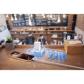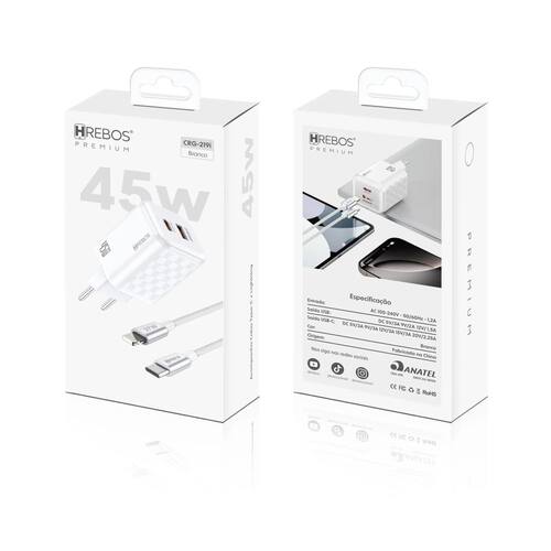 Carregador ultrarrápido de alta performance com 45W de potência. Possui interface de saída dupla e cabo de alta resistência com conexão Lightning (8 pinos). Estrutura em materiais de alta resistência térmica com proteção contra superaquecimento e variações elétricas. Gerenciamento eletrônico inteligente para distribuição de energia.Tipo