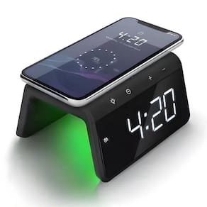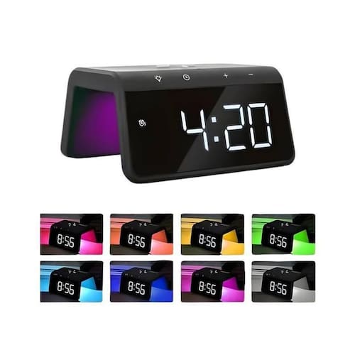 Carregador indução preto led 08 cores relógio e despertador Carregador de mesa por indução com relógio e despertador ===================================== Contém: 01 unidade