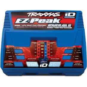 Inclui: -(1) Carregador de bateria dupla Traxxas EZ-Peak 100W com cabo de alimentação CA