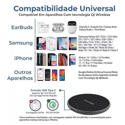 Para carregamentos rápidos e duradouros, utilize o carregador sem fio eleito o melhor carregador do mercado. Conforto e eficiência no seu dia a dia. A base de carregamento sem fio carrega um smartphone com transferência de 7,5W até 15w de potência Universal Fast Charge Edition . A parte superior da base é com um material antiderrapante, que absorve impactos e mantém o smartphone bem posicionado. Pode ser utilizado em todos os dispositivos com suporte para carregamento sem fio Qi .