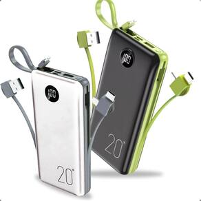Capacidade de 20.000mAh, ideal para múltiplas recargas. Possui saídas duplas para carregar dois dispositivos simultaneamente. Suporta de 4 a 6 cargas completas em smartphones. Design compacto e portátil.Tipo