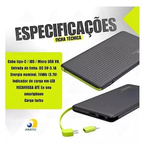 Carregador portátil externo powerbank 10000mah - universalidade e conveniência em um dispositivo Power bank 10.000mah com adaptador lightning para e v8. Além disso possui entrada usb para que possa utilizar seu cabo e carregar qualquer aparelho. Carregue seu celular, tablet, ou qualquer aparelho que possua entrada usb. Seu design elegante e ultra fino garante que você leve-o para qualquer lugar, tornando-se útil e prático Cabo no padrão v8, serve em praticamente todos celulares com android, acompanha também adaptador lightning Características: - agite para começar a carregar; - indicador de nível de carga em leds; - usa bateria de polímero de lítio para torna-lo mais fino e de alta performance; - tecnologia pass through charging, pode carregar seus dispositivos e ser recarregado ao mesmo tempo; - permite a recarga simultânea de dois aparelhos com muito mais velocidade; - moderno sistema de gel, apresenta baixa dilatação e elimina riscos de vazamento; - chip inteligente de reconhecimento, detecta automaticamente a tensão certa para não danificar seu celular; - construído em proteção da bateria ic para evitar o excesso de carga, sobre o descarregamento e curto-circuito; - adaptador lightning - adaptador v8 Informações técnicas: - produto: power bank - bateria: polímero de litio - capacidade: 10.000mah - capacidade da bateria interna: 3.7v/10000mah 37wh - entrada: micro usb dc 5v 2a - saída nominal: =6300mah =31.5wh - dupla saída usb: 5v 2.1a, 5v 2.1a - saida: dc5v 2.1a built in cable / dc5v 2.1a usb port - duração de bateria em standby: 500h - ciclo de vida: 500 recargas 1 recarga = de 0 a 100 - temperatura em trabalho: 0c to 40c - tempo carregamento do power bank: 3-5 horas - medida do cabo: 5cm - dimensões: 156 x 77 x 12 mm - peso: 228g - disponível nas cores: preto ou branco Homologação Anatel: 002682107745 Marca: Não Informado Ean: 7895348802187