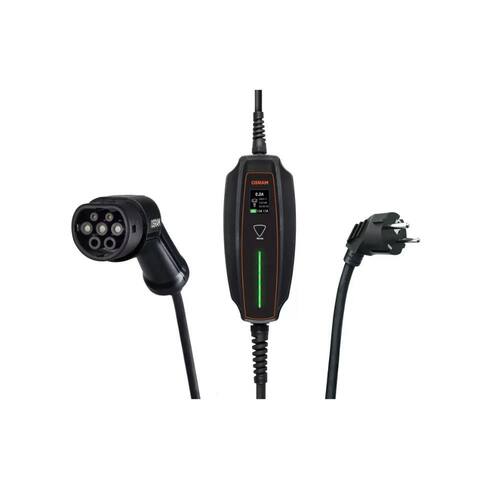 Dirija com a OSRAM rumo a um futuro mais livre de emissões Descubra o mundo da condução elétrica com a OSRAM. Carregue o seu veículo totalmente elétrico ou híbrido plug-in tipo 2 a partir de qualquer unidade ou estação de carregamento de 32 A (monofásico) equipada com um ponto de ligação tipo 2. O cabo de carregamento está equipado com pegas ergonómicas para um manuseamento ideal e tem um comprimento de cabo de 5 metros. É adequado para utilização em estações de carregamento públicas e em casa. Além disso, os cabos de carregamento estão equipados com tampas de proteção contra poeiras e testados quanto à resistência à água de acordo com IP65 e resistência a choques de acordo com IK10. Mesmo quando ligados, os pontos de contacto elétricos estão protegidos contra a entrada de pó e salpicos de água de acordo com IP65 e IK10. O âmbito de fornecimento inclui também uma bolsa de armazenamento durável e compacta para guardar o cabo de forma organizada após o carregamento. Além disso, o produto possui certificação TUV e CE e inclui uma garantia de 2 anos.