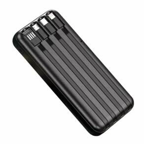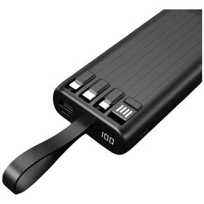 Power bank portátil com 20.000 mAh de capacidade, carregamento rápido (Turbo), visor digital para nível de bateria, 1 saída USB e 4 tipos de cabos integrados (Lightning, Type-C 3.0, Micro USB e USB). Alta potência e acabamento de qualidade.Tipo
