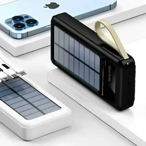 Carregador portátil com alta capacidade de 30000mAh, tecnologia de carregamento rápido e painel solar integrado para recarga em emergências. Possui 3 portas de saída USB, tela LED digital para visualização de carga e cabos integrados (iPhone/Tipo C/Micro USB) para maior conveniência. Entrada Tipo C e USB para recarga do próprio power bank.Tipo
