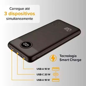 O Carregador Portátil (Power Bank) Ultra Rápido 10000mAh Power Delivery 20W possui 2 Saídas USB A mais 1 Entrada/Saída USB-C. Chegue até 4 cargas completas no seu smartphone e leve sua bateria para te acompanhar no trabalho, em shows, viagens e onde mais você precisar com muito estilo e qualidade. Power Delivery de até 20W (Carrega 50 porcento da sua bateria em 30 minutos - Dispositivos compatíveis com Power Delivery utilizando cabos USB-C mais USB-C ou Lightning mais USB-C). Tecnologia Smart Charge: 2 Saídas USB Inteligentes com tecnologia exclusiva que distribui a carga necessária para os dispositivos carregarem na velocidade máxima