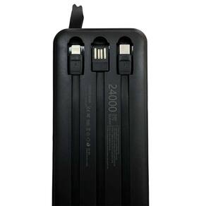 Powerbank com 24.000mAh de capacidade, 1x USB-A e 1x Tipo-C de saída, 1x Micro USB e 1x Tipo-C de entrada. Possui cabos embutidos (Lightning e Tipo-C Android) e um cabo USB-A para carregamento direto. Tensão de saída 5V/2.1A máx.Tipo
