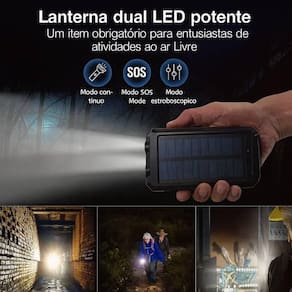 Power Bank Solar Portátil com chip integrado de reconhecimento inteligente de voltagem, bateria de alta capacidade e qualidade, suporta carregamento rápido, painel solar integrado, lanterna LED dupla integrada com 3 modos de iluminação (contínuo, SOS e estroboscópico), carregamento rápido via USB, entrada tipo C USB, mosquetão para prender em bolsas ou equipamentos.Tipo