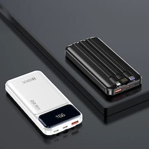 Conectividade Universal sem Cabos Extras Um dos maiores desafios dos carregadores portáteis comuns é a necessidade de transportar cabos que se embaraçam ou são esquecidos. Este modelo soluciona o problema com elegância: ele já possui conectores integrados de alta qualidade. Com saídas compatíveis com dispositivos de última geração (padrão de entrada reversível e conexões específicas para aparelhos de alta tecnologia), você tem em mãos uma central de carga pronta para uso. Além dos cabos embutidos, o corpo do equipamento conta com uma porta de entrada moderna para o seu próprio reabastecimento, permitindo que o conjunto seja recarregado com agilidade.