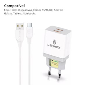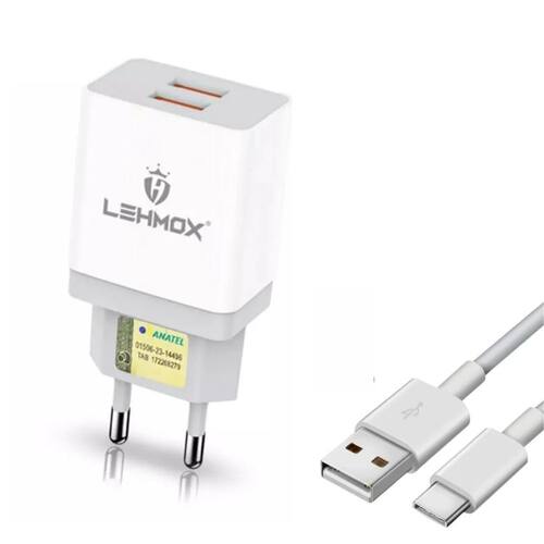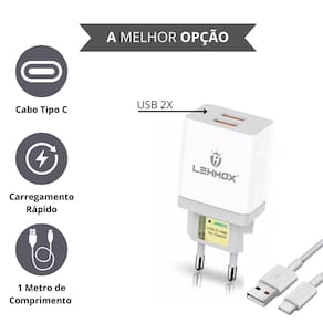 Duas portas USB, bivolt automático, acompanha cabo USB Tipo C de 1 metro.Acabamento do material