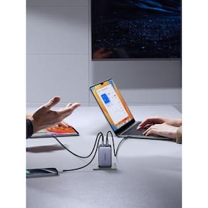 Um por todos: graças ao seu design compacto e que economiza espaço, o carregador de 65W é 31% menor que a fonte de alimentação de 67W. Apesar do seu tamanho, oferece 3 portas adicionais: muito práticas para carregar vários dispositivos ao mesmo tempo, não importa onde você esteja.