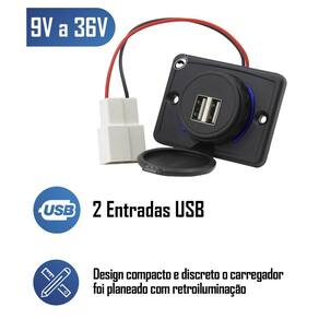 Carregador Tomada Usb Dupla Automotivo Orbe 9V A 36V Entrada 1A 5V Saída Carro Van Ônibus Caminhão Descrição:O carregador usb light possui duas saídas retroiluminadas de usb de 5v, possibilitando o carregamento de diversos dispositivos. Com design compacto e discreto o carregador foi planeado com retroiluminação, ajudando o usuário a encontrar o conector mesmo no escuro. As saídas de carregamento são compatíveis com a maioria dos smartphones e a proteção contra curto-circuto protege os aparelhos de qualquer surto de tensão. Corrente de carregamento é 1,5a e com baixo consumo de apenas 0,3w. Por ser um carregador fino, não é necessário fazer furação para encaixe, apenas necessitando furação para fixação com dois parafusos. Características:- tampa protetora para prevenir o acúmulo de poeira ou sujeira e danos quando em desuso prolongando a vida útil do dispositivo.- carregador usb duplo - luz suave de sinalização- led indicador auxilia o usuário a encontrar o encaixe mesmo quando a claridade estiver baixa. Especificação técnica:Alimentação: 9 32vCorrente de carga máxima: 2x 1,5aTensão de saída: 5vConsumo: 0,3wGrau de proteção: ip65Cor: pretaTemperatura de operação: -20c 60cQuantidade led's : 2 ledCor da iluminação: azulPeso aproximado: 100gDimensões a x l x p: 48 x 64 x 18mm Conteúdo da embalagem:- 01 carregador usb duplo