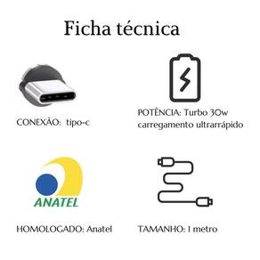 -turbo 30w -1 metro -homologado pela anatel -cor preto e branco escolher na hora da compra -produto de alta qualidade Homologação Anatel: 056692414286 Marca: Não Informado Ean: 7791807688913
