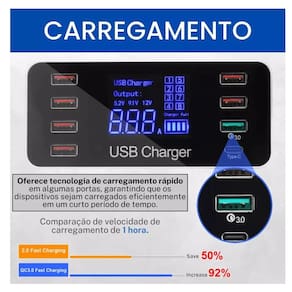 O design compacto do carregador não ocupa muito espaço e ainda conta com um painel LED que exibe informações sobre o status de carregamento, garantindo que você tenha total controle sobre a carga dos seus dispositivos. Seja para uso pessoal ou para atender às necessidades de uma equipe, o Carregador Turbo De Mesa USB 8 Portas é a solução perfeita para facilitar o seu dia a dia.