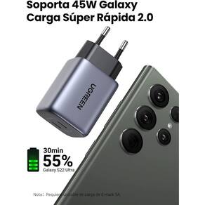 Carregador usb c de 45w o carregador ugreen usb c suporta potência de até 45w, compatível com versões anteriores de 30w/25w/20w. Suporta vários protocolos de carregamento rápido do que pd 3.0, pps, qc 4+/3.0 e scp para ser compatível com vários dispositivos como laptops, smartphones, tablets.
