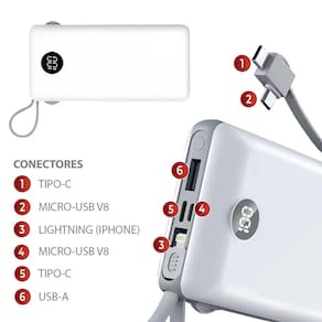 Carregador portátil e versátil para seu celular e acessórios, boa capacidade de carga com 20.000 mAh você pode carregar mais de um aparelho por vez graças aos seus cabos embutidos e sua saída USB. Ideal para levar na bolsa, mochila e mala.