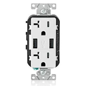 TomadaCarregador de parede USB tipo A Leviton T5832-W com tomada resistente a violações de 20 A, carregador USB para smartphones, branco