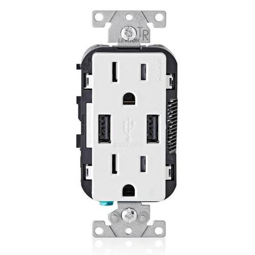 Leviton Carregador USB tipo A na parede com tomada 15A resistente à violação, carregador USB para smartphones, T5632-W, branco