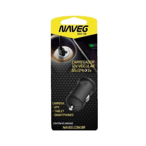 Carregador Veicular 12V Nva 710Marca: navegModelo: nva 710O carregador 12v veicular naveg converte as correntes 12v e 24v do seu carro em 5v com 1 ampère. Características do produto:- design compacto e discreto- para todos os tipos de smartfones - leve e ergonômicoMedidas aproximadas do produto- Comprimento: 10 cm- Altura: 30 cm- Largura: 20 cm- Peso: 0,2 g