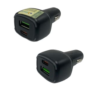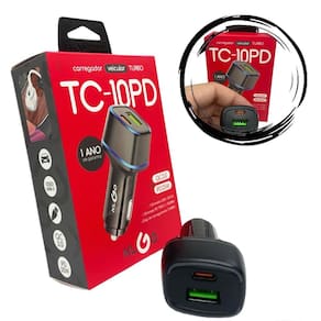 Carregador veicular com 2 portas (USB-A QC3.0 e USB-C PD 25W), chip inteligente para adaptação de potência, proteção contra sobrecarga e superaquecimento. Design compacto e portátil.Tipo