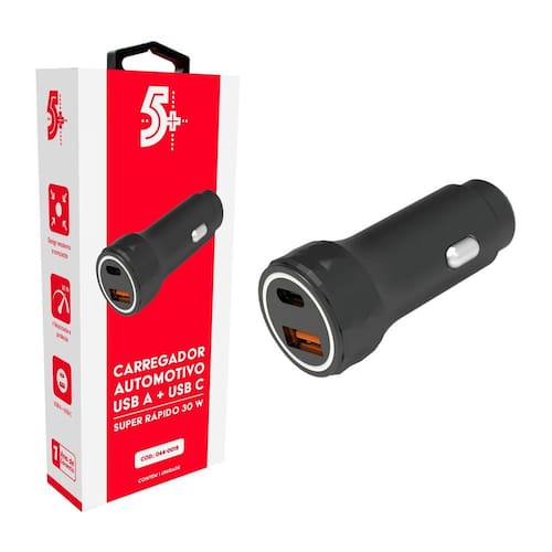 Carregador automotivo super rápido com 2 portas USB (USB-A e USB-C), 30W de potência total e tecnologia PD Power Delivery.Tipo