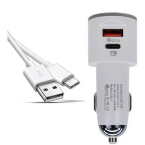 Carregador veicular com duas entradas (Tipo C e USB), suporta carregamento rápido PD+CQ 3.0. Potência de 18W + 18W. Inclui cabo USB-A para USB-C de 1 metro.