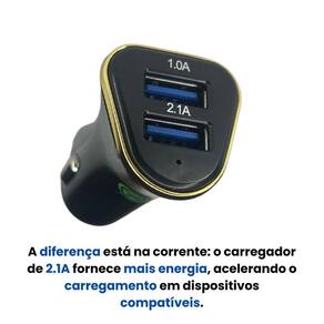 Carregador veicular com 2 portas USB, entrada DC 12V-24V, saída DC 5V/3.1A total. Permite carregamento simultâneo de dois dispositivos (distribuição de 2.1A e 1.0A). Design moderno e compacto. Proteção contra sobretensão e sobrecarga.Tipo
