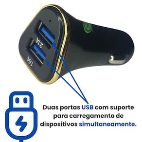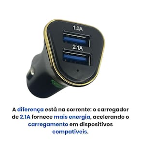 Carregador veicular com duas portas USB, permite carregamento simultâneo de até dois dispositivos. Corrente total de saída de 3.1A. Ao utilizar ambas as portas, a distribuição é de 2.1A e 1.0A. Design moderno e compacto. Proteção contra sobretensão e sobrecarga.Tipo
