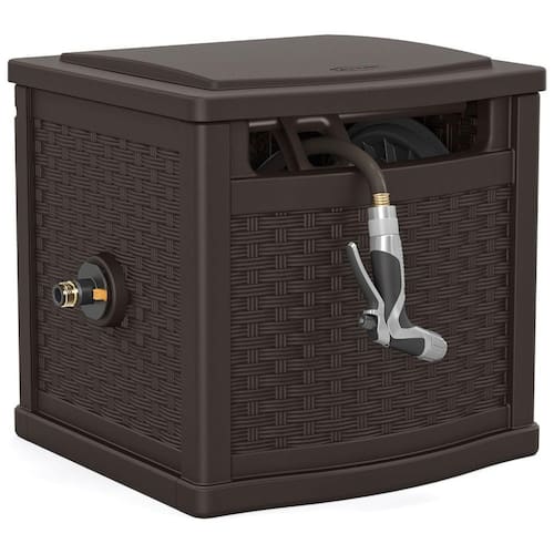 - Possui conexões de latão resistentes que evita vazamentos e ajuda a proteger contra rosqueamento cruzado e corrosão - O design contemporâneo de vime resiste a elementos naturais para uso duradouro e oferece uma experiência de baixa manutenção e fácil de limpar para manter a caixa do carretel de mangueira limpa e arrumada. A
