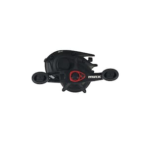 Carretilha de perfil baixo Abu Garcia Max SX para pesca, lado esquerdo, design leve, corpo e laterais em grafite, engrenagem Duragear em latão, sistema de freio Power Disk.