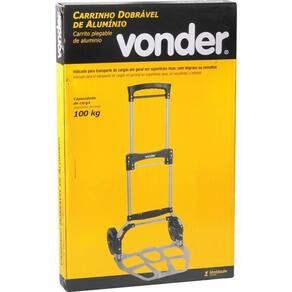 Conteúdo da Embalagem:1 Carrinho dobrável Descrição:Carrinho dobrável de alumínio 100 kgf, VONDERAplicações e dicas de uso:Indicado para transporte de cargas em geral em superfícies lisas, sem degraus ou ressaltos. Não deve ser utilizado para transportar pessoas ou animais.Destaques e diferenciais:Possui estrutura em tubos de alumínio, conexões em polipropileno, rodas revestidas com borracha sintética, base dobrável, cabo telescópico e plataforma em alumínio fundidoCaracterísticas Técnicas:Material da roda do carrinho dobrável: Polipropileno revestido com borracha sintética Tamanho da roda do carrinho dobrável: 7.0/0 Altura mínima do carrinho dobrável: 79,0 cm Altura máxima do carrinho dobrável: 107,0 cm Largura da base do carrinho dobrável: 48,0 cm Comprimento da base do carrinho dobrável: 35,0 cm Capacidade de carga do carrinho dobrável: 100 kgfGarantia legal: 90 dias Ean: 7893946545109