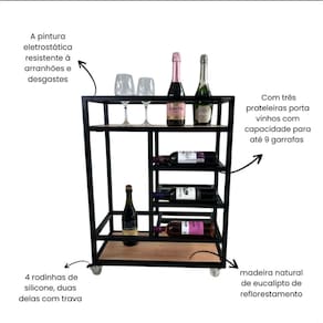 O carrinho bar também pode ser utilizado como adega, pois possui espaço para acomodar 9 garrafas de vinho, basta usar a sua criatividade. Também tem 2 suportes para taças de vinho ou espumante.