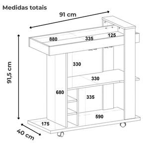 O Carrinho bar é ideal para quem valoriza organização e funcionalidade na hora de montar um cantinho especial em casa. Produzido em MDP de 15 mm, tampo espelhado, 6 porta taças metálicos, 3 nichos para garrafas, 1 prateleira e rodízios com travas em plástico ABS. O carrinho suporta até 8 kg (tampo 2kg, prateleira 2kg e estrutura 4kg). Além do seu acabamento com pintura UV texturizada de longa durabilidade e fácil limpeza. Este móvel chegará em sua casa separado em 01 volume.