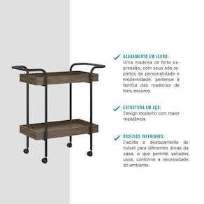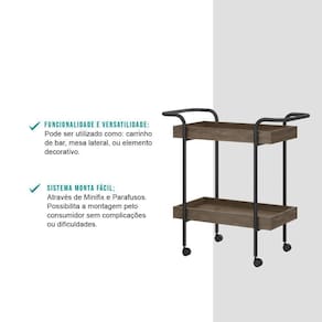 O Carrinho Bar Carraro é uma peça curinga para a decoração, extremamente versátil e funcional, pode ser utilizado em diversos ambientes da casa. É o complemento perfeito para compor o espaço e facilitar o dia a dia. Além disso, conta com rodízios que facilitam o deslocamento, possibilitando o compartilhamento da peça entre áreas diferentes.Especificações do Produto:Medidas: Largura: 84,5 cm | Altura: 83 cm | Profundidade: 40,5 cmPeso: 10,60 KgMatéria Prima: MDPAcessórios: RodíziosMontagem: Minifix e ParafusoGarantia:Os produtos possuem garantia de 03 meses (se usado em condições normais), contra defeito de fabricação, ou componentes utilizados.Esta garantia não cobre defeitos por uso inadequado ou abusivo, falta de cuidados e desbotamento natural dos revestimentos.Condições de perda da garantia:- Mau uso ou manuseio incorreto.- Desbotamento causado pela exposição direta da luz solar.- Danos causados por agentes da natureza, como inundações ou acidentes de qualquer espécie.- Uso indevido de produtos abrasivos para realizar a limpeza.- Decurso do prazo estabelecido.Recomendações para uma boa conservação:- Não utilizar na limpeza produtos abrasivos tais como: palha de aço, álcool, vinagre, limão, saponáceo, ou produtos corrosivos que possam riscar ou descolar a película protetora dos móveis.- Na limpeza de móveis em geral, napas e fórmicas, deve ser utilizado um pano levemente umedecido e sabão neutro.- Para a movimentação do móvel é importante que este seja levantado do chão, pois ao arrastá-lo pode causar avarias estruturais.- Não deixe o móvel em exposição a intempéries.Informações importantes:- Trabalhamos para apresentar imagens fiéis ao produto real. Porém, as cores podem sofrer variações de acordo com o monitor, iluminação do ambiente em que se encontram e até por sua percepção visual comparado ao ambiente residencial.- Desta forma, as imagens são meramente ilustrativas.- Todos os objetos decorativos não acompanham o produto.- O produto é enviado desmontado.- O produto acompanha manual com instruções para a montagem.