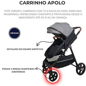 Carrinho de bebê 3 em 1 passear apolo moisés reversível capota retrátil preto com cinza até 15 kg Este versátil carrinho 3 em 1 é a escolha ideal para pais modernos, oferecendo conforto e praticidade desde o nascimento até os 15kg da criança. Com um cinto de segurança de 5 pontos e estrutura em aço, o carrinho apolo garante segurança e durabilidade incomparáveis. Seu assento reversível e ajustável em várias posições permite adaptar-se às necessidades dos pequenos em diferentes fases. O assento do carrinho apolo pode ser transformado em um moisés para os momentos de descanso do bebê com facilidade. Possui 2 rodas dianteiras giratórias ou fixas e 2 rodas traseiras com sistema único de freios, garantindo a estabilidade e mobilidade necessárias para os passeios. Características: Cor: cinza com preto Assento com ajuste em várias posições Cinto de segurança Cesto com capacidade de 2 kg Capota retrátil Porta copo Assento vira moisés Fechamento com uma única mão Freio com sistema único de acionamento Carrinho 3 em 1 Cinto de segurança de 5 pontos Compatível com bebê conforto aconchego vendido separadamente Assento reversível e ajustável para várias posições Assento transforma em moisés 2 duas rodas dianteiras giratórias Sistema único de freio nas rodas traseiras Detalhes em material sintético Cesto porta objeto com capacidade de 2 kg Capa de proteção para os pés Inmetro: 012132/2023 : 12 meses direto com o fabricante Medida do carrinho aberto: 100 x 59 x 84 cm axlxp Homologação Inmetro: CE-BRI/IQB 000280 52375/18-107