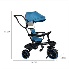Especificações técnicas: - possui pedal p/pedalar - possui apoio de pés - possui duas cestas: - cesta dianteira aprox. c: 13cm x l: 12cm x a: 6cm - cestatraseira aprox. c: 21cm x l: 35,5cm x a: 12cm - possui guarda-sol com proteção mosquiteiro - possui trava de segurança - possui capa de assento almofadada - possui pneus emborrachado