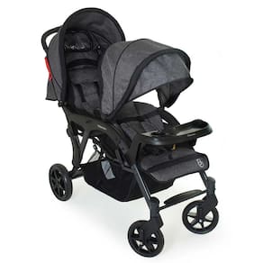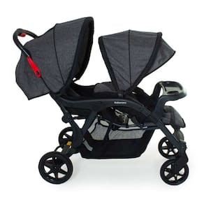 Carro passeio para gêmeos destinado para crianças a partir de 6 meses com peso até 15 kg (capacidade máxima 30kg); Estrutura em Aço; Encosto regulável em 3 posições; Cinto de segurança 5 pontos; Bandeja com porta copo, removível e de fácil encaixe de travamento; Protetor ombro; 2 Rodas dianteiras com travamento no sistema giratório; Rodas dianteiras removíveis; 2 Rodas traseiras com único sistema de freio; Eixos traseiros removíveis; Capota traseira retrátil; Capota de traseira com visor; Capota dianteira com aba retrátil; Capota dianteira retrátil e removível; Sistema de fechamento com uma mão; Apoio para os pés em ambos os lugares; Composição têxtil 100 poliéster; Acopla o DRC 8181DPT (VENDIDO SEPARADAMENTE) titulo completo: Carrinho Bebê Gemeos Doppio Galzerano Grafite