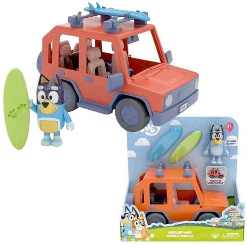 Agora você pode levar Bluey e sua família em viagens no veículo familiar Heeler Four Wheel Drive 4X4 Há muito espaço para toda a família Abra a parte superior do veículo para caber todas as figuras dentro. Coloque o pai no banco do motorista para que ele possa levar a família até a praia. O veículo familiar com tração nas quatro rodas Heeler tem um rack no teto que contém duas pranchas de surf. Todas as figuras são compatíveis com as pranchas de surf. Decore o interior do veículo com os lindos adesivos incluídos no brinquedo Acompanha 1 figura do pai Bandit . A brincadeira ficará muito mais divertida com o Veículo Four Wheel Drive 4X4 Family da Bluey