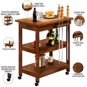 Fazer aquele churrasco de primeira é sem dúvida um dos melhores momentos para reunir família ou os amigos! Desta forma, ter um carrinho auxiliar de churrasco é super importante para servir refeições, acompanhamento ou bebidas com higiene e praticidade sem preocupações. Possui amplo espaço para armazenamento de acessórios ou condimentos em sua gaveta e suas prateleiras, suporte de espeto e suporte de talheres grandes. Sem abrir mão da beleza, o carrinho gourmet possui uma tábua de cortes móvel que o deixa ainda mais prático e contribui com a decoração da área de churrasco ou cozinha. Com ele a sua área gourmet está preparada para aquele final de semana!