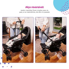 Alça Reversível: Escolha entre conduzir o carrinho de frente para o bebê nos primeiros meses ou permitir que os mais crescidinhos apreciem a paisagem.