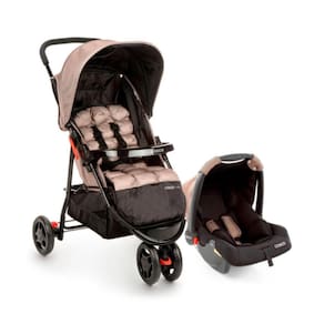 Conjunto do bebê conforto Wizz com o carrinho de 3 rodas Toffy com colchonete macio, barra frontal e reclinável em múltiplas posições, incluindo o modo berço ou passeio.