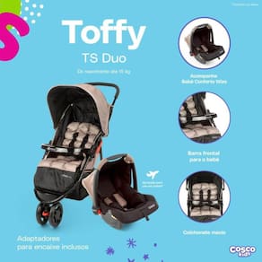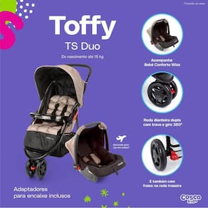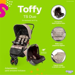 Para pais que querem conforto e modernidade, o conjunto TS Toffy Duo da Cosco, para uso desde o nascimento, possui inclinação em múltiplas posições e ajuste do apoio dos pés, trazendo um formato aconchegante para os recém-nascidos e vai acompanhando o crescimento da criança, ajustando-se para o dia a dia e todos os passeios da família.