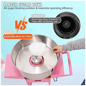 Atenda às suas demandas comerciais Equipada com potência de aquecimento de 1000 watts e um motor robusto de 35 watts, nossa máquina de algodão doce rosa pode funcionar continuamente e custa apenas 30 segundos para produzir um algodão doce. A cabeça giratória de alto desempenho comporta. de açúcar floss para evitar o reabastecimento repetido e garantir uma operação eficiente. Operação simples com controle de temperatura Ao contrário dos comuns, nosso fabricante de algodão doce elétrico possui um botão de controle de temperatura. Se você quiser experimentar açúcares com sabores diferentes, você absolutamente precisará disso. Usar esta máquina não poderia ser mais fácil. Simplesmente ligue a energia, ajuste a temperatura, deixe aquecer por 5 6 minutos e, em minutos, deliciosos algodão doces estarão prontos. Estrutura confiável e limpeza fácil graças à construção em aço inoxidável e aço resistente, nosso fabricante de fio de algodão doce pode suportar os rigores da alta demanda. A tigela de aço inoxidável possui um grande diâmetro de , que é bastante fácil de ser removido, facilitando a limpeza no final do evento. Além disso, os clipes de trava ajudam a segurar a tigela para minimizar a vibração, tornando a operação silenciosa e suave. Projetos de fácil utilização A máquina elétrica de algodão doce vem com uma gaveta de suprimento de aço embutida. Ele ajuda a fornecer espaço de zenamento extra para cones, bastões de algodão doce ou pacotes de açúcar de fio dental. Ele mantém seus suprimentos sempre ao seu alcance durante o uso e agiliza sua operação. Além disso, uma colher de açúcar prática está incluída para tornar o derramamento de açúcar incrivelmente fácil