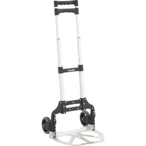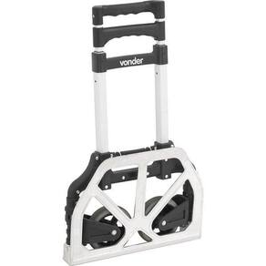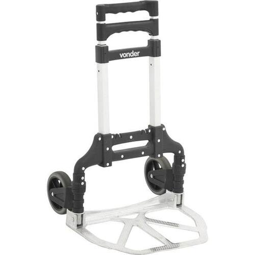 Possui rodas revestidas com borracha sintética, base dobrável, cabo telescópico e plataforma em alumínio fundido